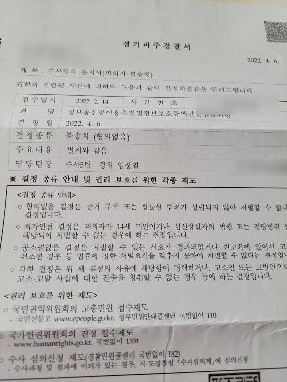 참고로 불송치 결정이라 하면 경찰 측에서 혐의가 없다고 판단될 경우, 검찰에 송치하지 않고 자체적으로 사건을 종결시키는 것을 의미합니다.