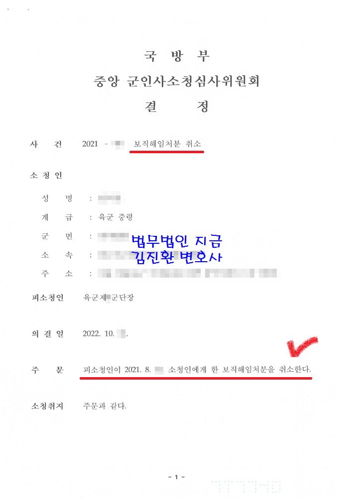 최근 국방부 인사소청심의위원회에서 보직해임에 대한 취소결정을 받게 되었습니다.