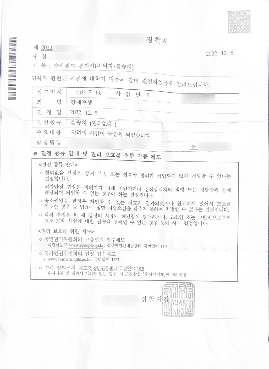 오늘 들려드릴 사례는, 언더 댄서로 오랜 기간 활동하다 유명 경연 프로그램에 출연하여 결선 진출을 목전에 둔 상황에서 상대방의 거짓 고소 협박, 합의금 종용 등으로 프로그램에서 하차하게 되고 상대가 원하는 합의금을 지급하지 않자 끝내 추행죄로 고소한 의뢰인을 도와