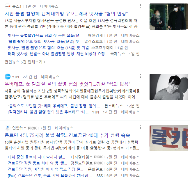 우선 한동안 떠들석했던 불법촬영(카메라등이용촬영 혹은 유포·반포 등 범죄)