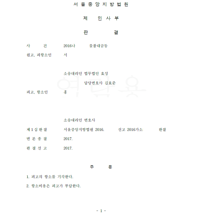 저는 항소심에서 피고의 항소이유가 전부 이유 없음을 각종 증거로 주장 입증하였고 결국 법원은 피고의 항소를 기각하여 의뢰인은 물품대금 전부를 지급받았습니다.