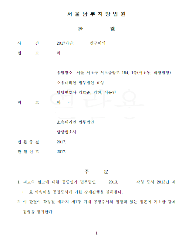 저는 즉각 피고를 상대로 청구이의의 소를 제기하면서 위 사정을 주장 입증하였고 법원은 저희의 주장을 모두 받아들여 승소 판결을 선고하여 의뢰인은 채무에서 벗어나게 되었습니다.