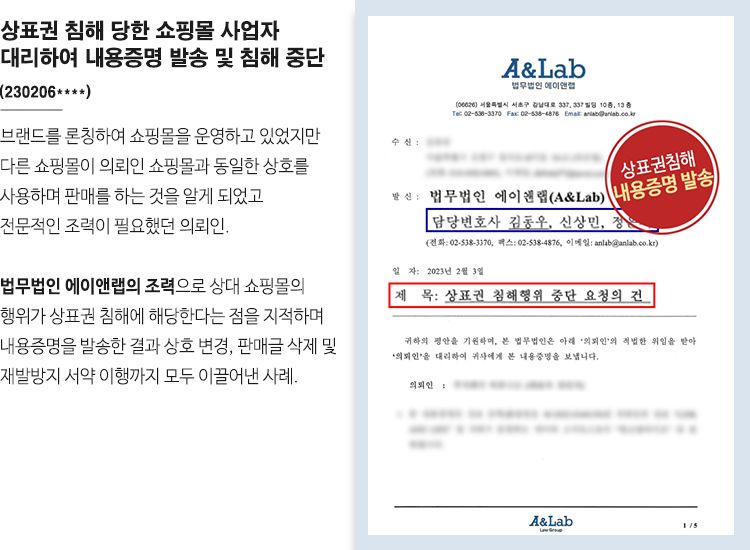 그 결과 상대 쇼핑몰측은 김동우 변호사가 발송한 내영증명의 사항(상호 변경, 동일 상호 판매글 삭제, 재발방지 서약)을 모두 이행하며 의뢰인의 요구사항을 전부 달성하였습니다.