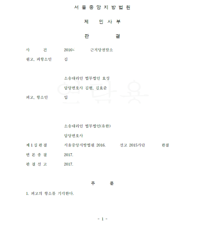 항소심은 저희의 주장을 모두 받아들여 피고의 항소를 기각하였고 저희는 판결 확정 후 즉각 근저당권을 말소하였습니다.