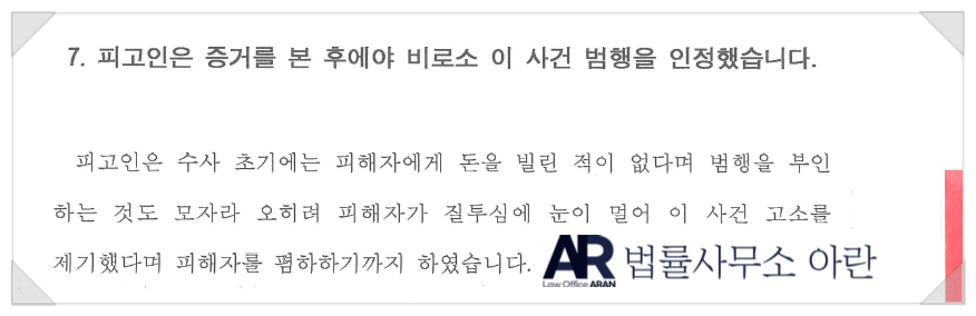 최아란 변호사는 의뢰인과 A씨가 주고받은 수개월간의 카카오톡을 모조리 분석하여 A씨가 의뢰인으로 하여금 돈을 빌려줄 수 밖에 없게끔 만든 정황, A씨가 의뢰인에게 돈을 갚겠다고 말하는 내용 등을 빠짐없이 취합하였습니다. 그리고 이러한 내용을 담아 촘촘하게 변호인의견서를 작성하여 제출하였습니다.