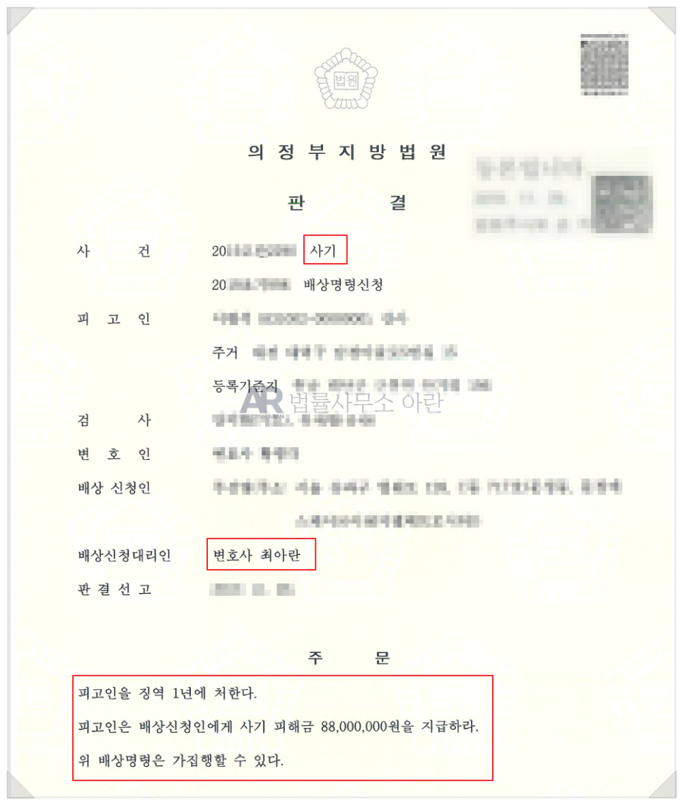 결국 A씨는 내연남 사기 건으로 입건되어 그대로 기소되었습니다. 그리고 의뢰인은 제1심 재판 진행 중 A씨를 상대로 빌려준 돈의 배상을 요구하는 형사배상명령을 신청하였는데요.
