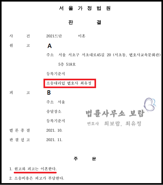 그로 인해 A는 재판을 시작한지 약 4개월 만에 B와 이혼하라는 판결을 받게 되었고, 약 6개월 만에 이혼 신고까지 완료하게 되었습니다.