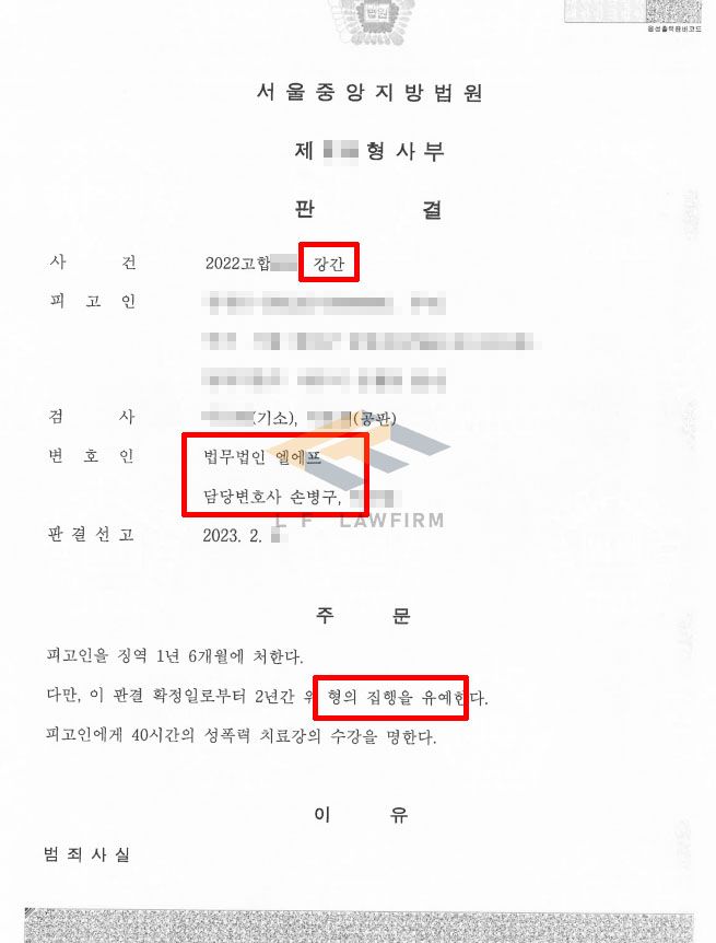 의뢰인은 강간 현장에서 신고로 출동한 경찰에 의해 적발되어 사건이 진행되게 되었고, 피해자는 도움요청 등을 하였던 상황이라 혐의를 부인하기 어려웠으며, 성범죄 중 중범죄인 강간죄라 중한 처벌이 예상되는 상황이었습니다.