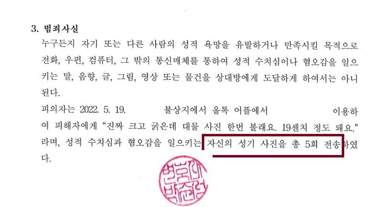의뢰인 님은 채팅어플인 '올톡' 이용 중 자신의 성기 사진을 상대방에게 총 5회에 걸쳐 전송하였습니다.