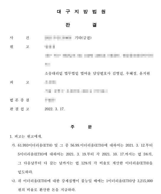 해당 비상장코인은 애초에 상장될 가능성이 없었으며, 의뢰인은 피고의 거래소 상장의무 불이행을 이유로 해당 비상장코인 판매 계약을 해제하고 판매대금으로 지급한 이더리움 반환을 청구하였습니다. 이 사건의 경우 해당 비상장코인이 상장될 것을 전제로 한 계약이라는 명시적 기재는 없었습니다. 하지만 의뢰인과 피고 사이의 카카오톡 대화를 정리하여 특정 날짜까지 상장될 것으로 의뢰인과 피고 간에 합의하였다는 점을 계약상 내용으로 보충하였습니다. 계약 해제를 원인으로 하여 이더리움을 반환 청구하고 예비적으로는 피고의 불법행위를 원인으로 손해배상 청구를 하였습니다.
