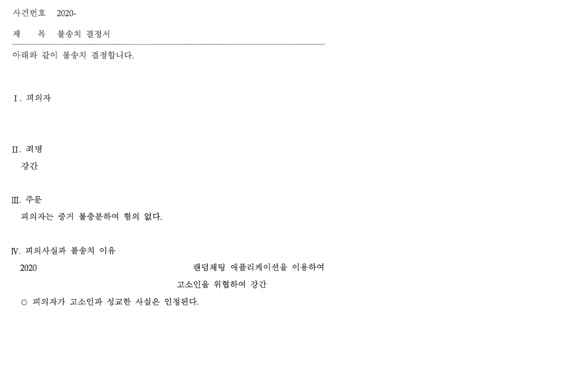 이 사건은 위와 같은 변호인의 조력을 통해 동의 없이 간음하였다는 점에 대한 증거가 부족하다는 점이 인정되었는바, 불송치(혐의없음)을 받게 되었습니다. 최근 랜덤채팅 어플리케이션을 통해 불특정다수와 성적 접촉을 하는 경우가 많고, 동의 하에 성관계가 이루어졌음에도 불구하고 태도를 돌변하여 고소를 하는 경우가 있습니다. 특히 사건의 당사자들 사이에 은밀히 만남이 이루어지는 경우 명확한 증거가 없는 경우가 많기에, 진술의 신빙성 등을 논하는 경우가 많으므로 이 경우 변호인의 조력이 반드시 필요합니다.