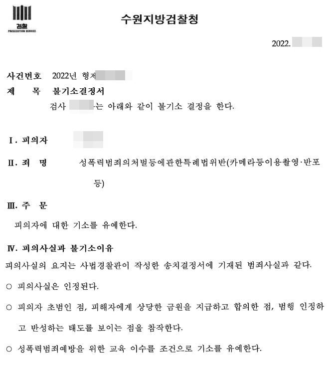 최근 카메라를 이용한 범죄 사건이 중형에 처해지고 있는 만큼 매우 중한 사건이었음에도 신속한 준비로 성범죄 전과가 남지 않는 기소유예 처분으로 종결한 성공적인 사례였습니다.