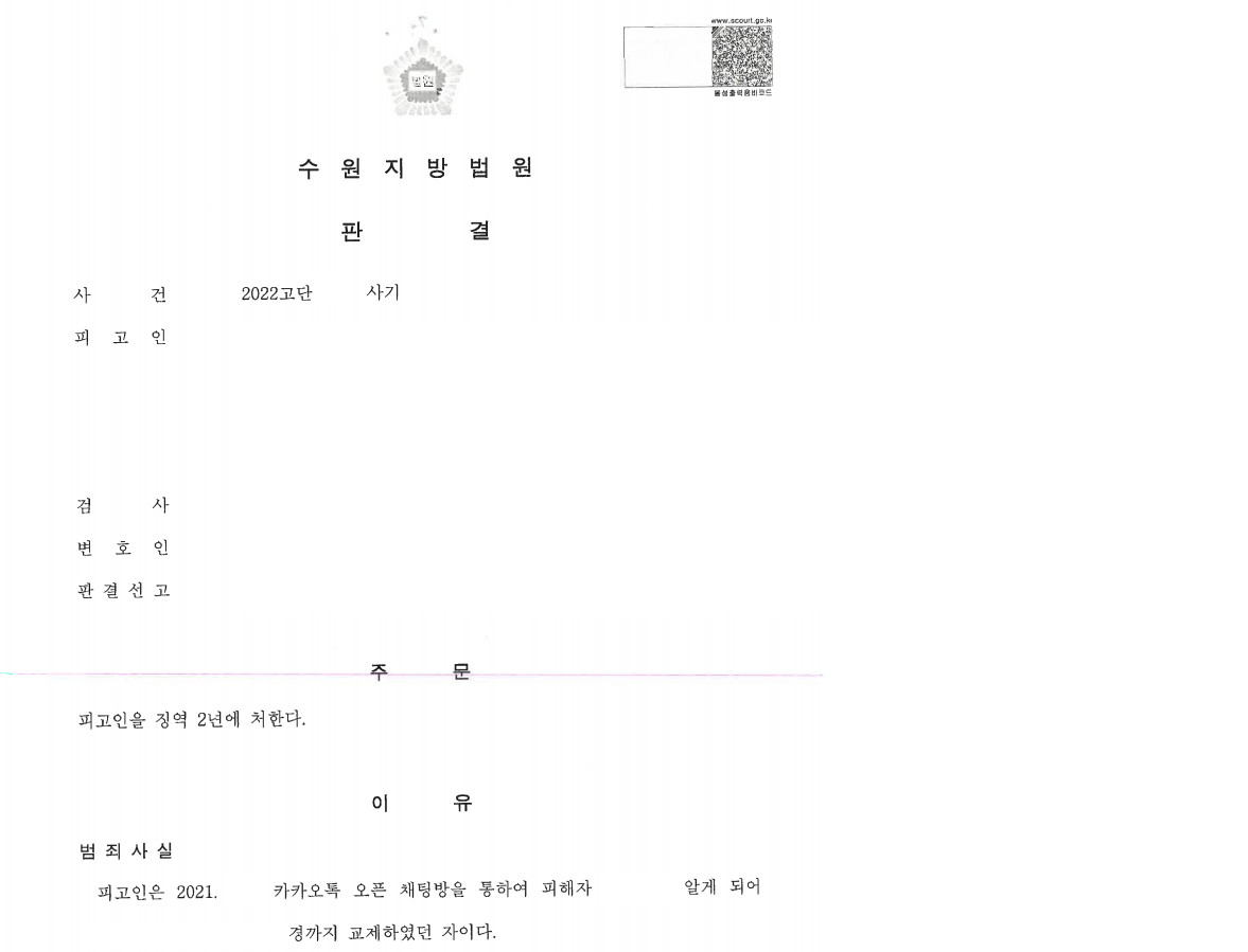 위와 같은 변호인의 조력을 통해 수사기관은 피고인을 재판으로 넘겼고(구공판), 피고인은 징역 2년을 선고받게 되었습니다.