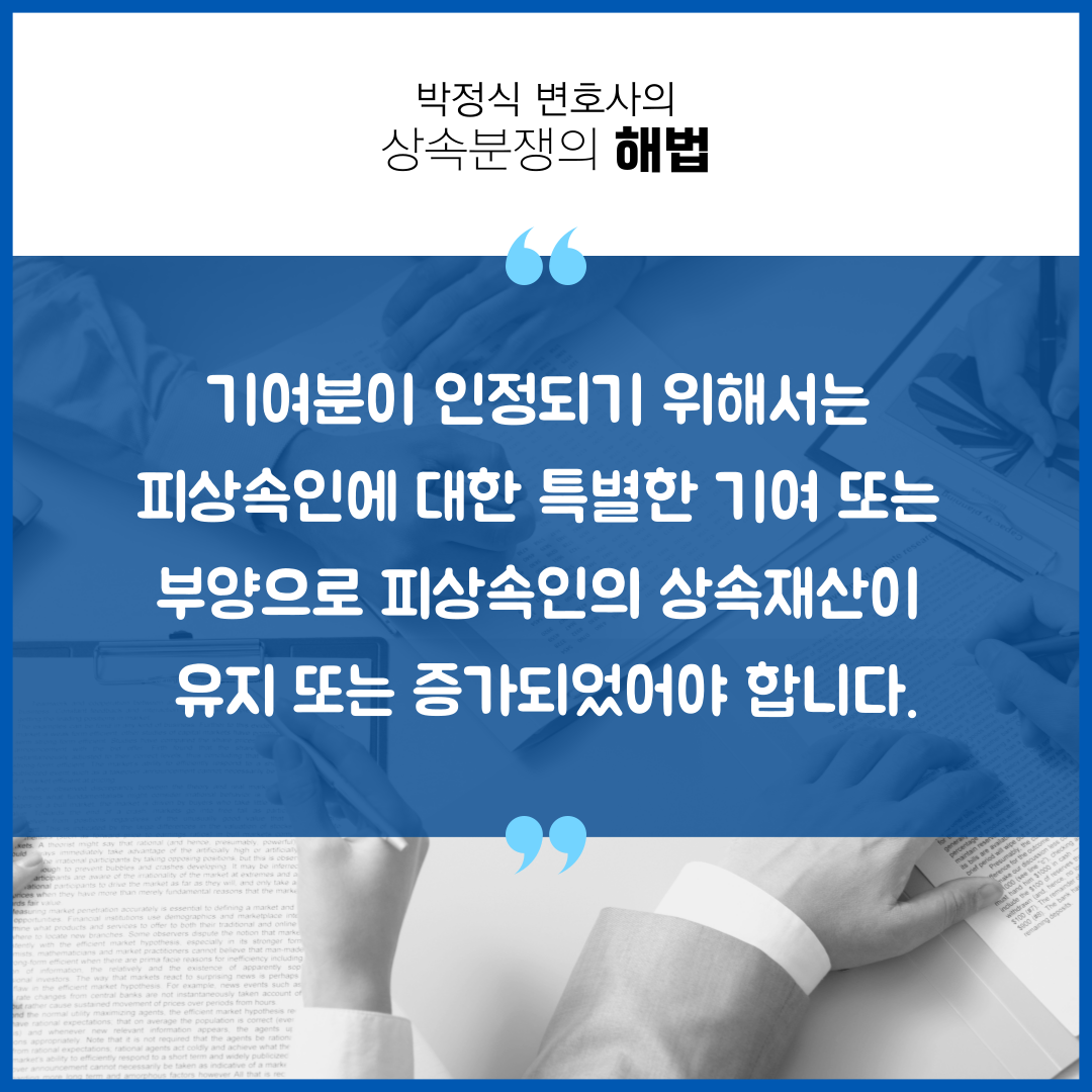 다. 나아가 상속인이 피상속인을 특별히 부양하거나 상속인의 특별한 기여의 결과 피상속인의 재산이 유지 또는 증가되었어야 합니다.