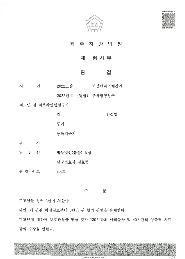 저는 즉각 이 사건의 경위, 피고인의 불우한 가정환경 등을 중점적으로 주장하였고 한편 피해자와의 합의를 이끌어내어 법원은 집행유예를 선고하고 전자장치부착명령청구를 기각하였습니다.