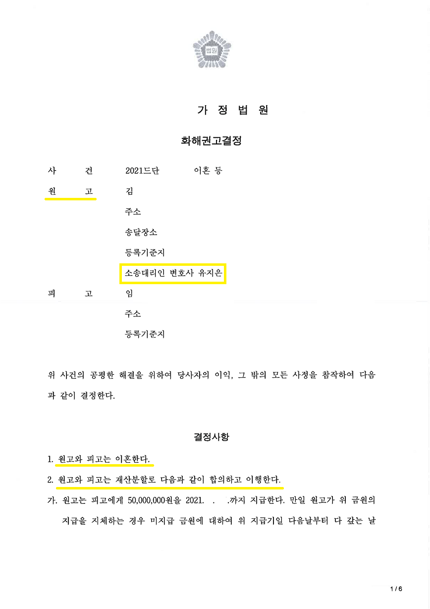 저희가 사전처분을 신청하고 3개월 만에 접근금지 결정이 나왔으며, 판결로 갔을 경우 기여도가 50% 인정된다 하더라도 의뢰인은 부동산이 아닌 가액으로 5억만을 받아올 수 있었는데, 남편을 잘 설득하여 재산분할로 10억 원의 부동산을 의뢰인이 받아오고 약 1억만을 의뢰인이 부담하는 내용으로 합의가 성립되어 성공적으로 마무리된 사안입니다.