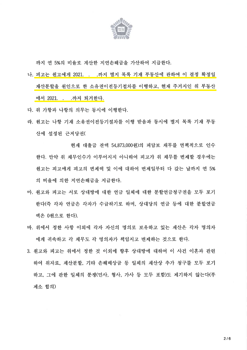 저희는 22년의 혼인기간 동안 의뢰인이 가사와 두 아이의 양육을 전담한 점을 적극적으로 주장하여 기여도 50%를 주장하였고, 두 아이와 함께 위 아파트에서 계속 거주해야 하는 사정을 설득하는 데 주력하였습니다. 또한 경제활동을 하지 않은 의뢰인이 아파트를 받아오고 5억을 남편에게 정산해 줄 경제적 여력이 없는 점을 강조하여 약 5,500만 원 남은 담보대출금을 인수하고 추가로 5천만 원만 지급할 수 있도록 남편을 적극적으로 설득하였습니다.