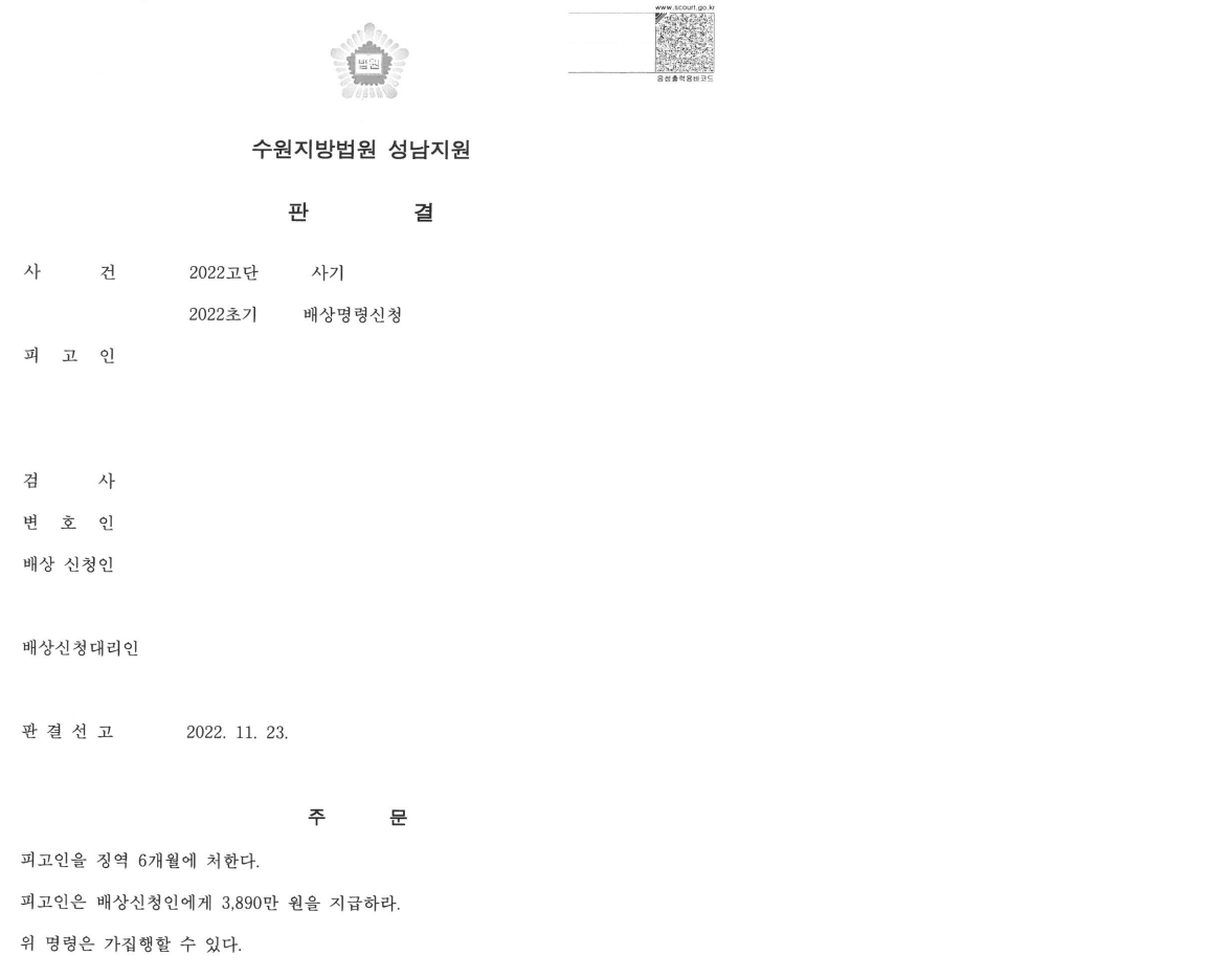 위와 같은 변호인의 조력을 통해 수사기관은 피고인을 재판으로 넘겼고(구공판), 피고인은 징역을 선고받게 되었습니다.
