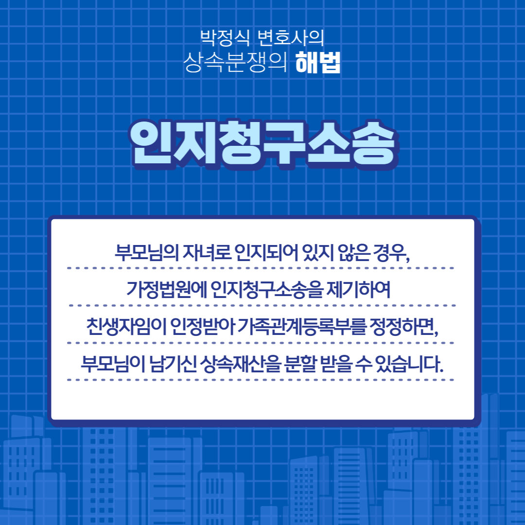 인지가 되지 않는 자녀는 인지가 되어야 부모님의 상속인으로 인정되어 부모님이 남기신 상속재산분할을 받을 수 있습니다. 부모님이 사망하거나 인지를 거부하는 경우 가정법원에 인지청구소송을 하여 인정되면 가족관계등록부에 자녀로 이름을 올릴 수 있게 됩니다. 인지소송이 확정되기 전에 상속재산이 이미 분할되었을 경우에는 인지소송 확정 후에 상속분에 상당하는 가액을 청구할 수 있습니다.
