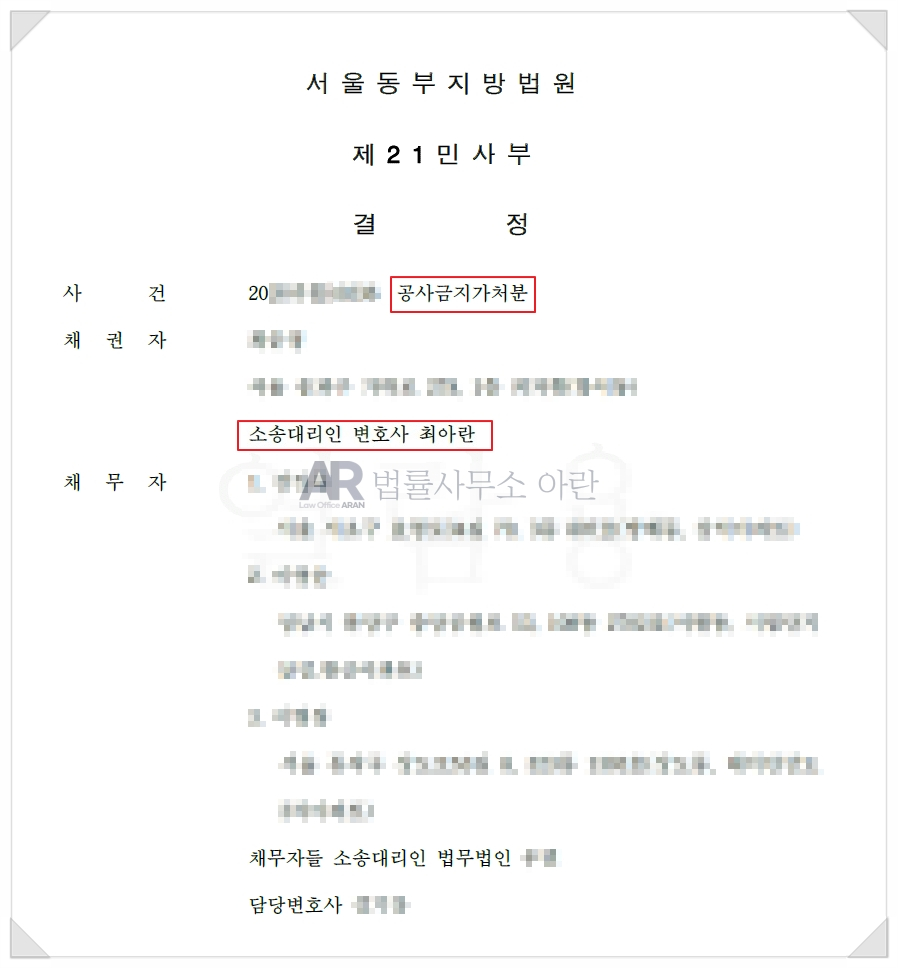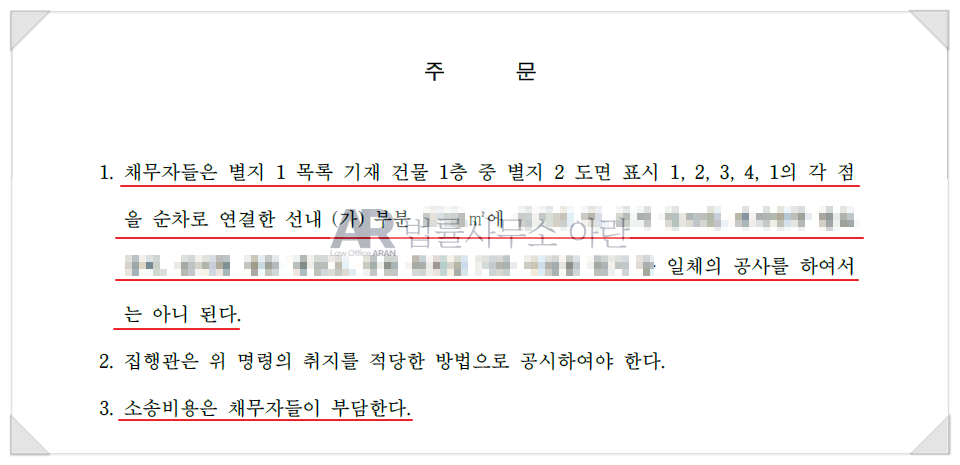 결국 재판부는 의뢰인이 쟁점 부분의 철거를 금지시킬 권리가 있다고 보아 "채무자들(임대인들)은 쟁점 부분의 철거 등 일체의 공사를 하여서는 아니된다. 소송비용은 채무자들(임대인들)이 부담하라"라며 의뢰인의 공사금지 가처분 신청을 인용하였습니다.