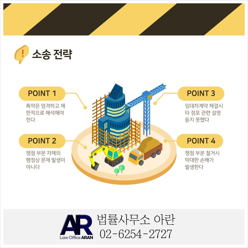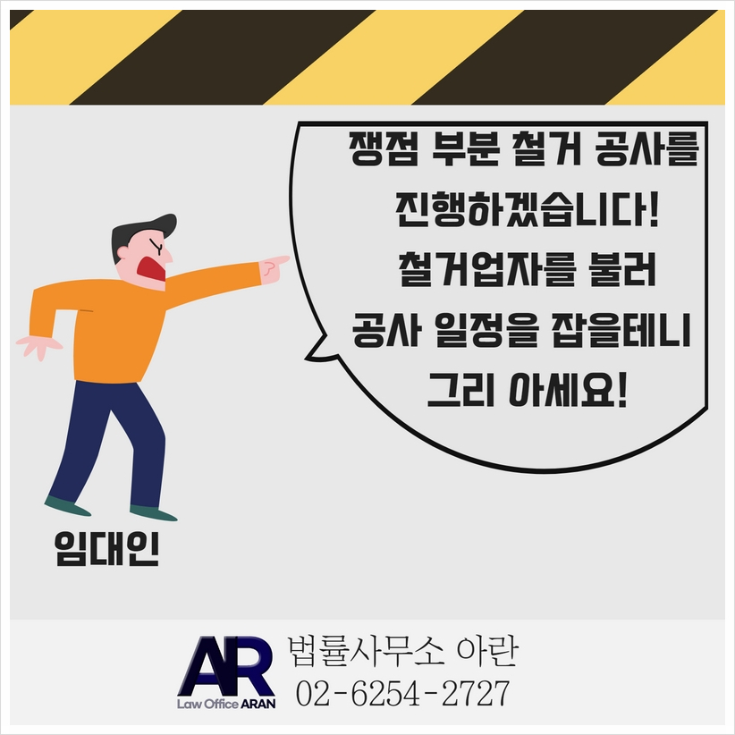최아란 변호사는 임대인의 철거 요구가 타당하지 않다고 판단하고, 아래와 같은 소송 전략을 수립한 다음 임대인을 상대로 공사금지 가처분을 제기하였습니다.