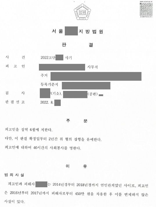경찰은 비록 전 남자친구에게 기존의 채무가 많았지만 그만큼 월 수익도 많았기 때문에 돈을 차용할 시점에 변제의사나 변제능력이 있었던 것으로 보인다며 불송치결정을 하였으나, 적극적으로 이의신청을 한 결과 검찰은 경찰의 결정을 뒤집고 사기죄를 인정하여 불구속구공판을 하였습니다. 의뢰인은 가해자로부터 합의금을 받아 피해를 회복할 수 있었고, 법원은 합의가 이루어졌음에도 가해자인 남자친구에게 징역 6월에 집행유예 2년, 40시간의 사회봉사를 선고하였습니다.