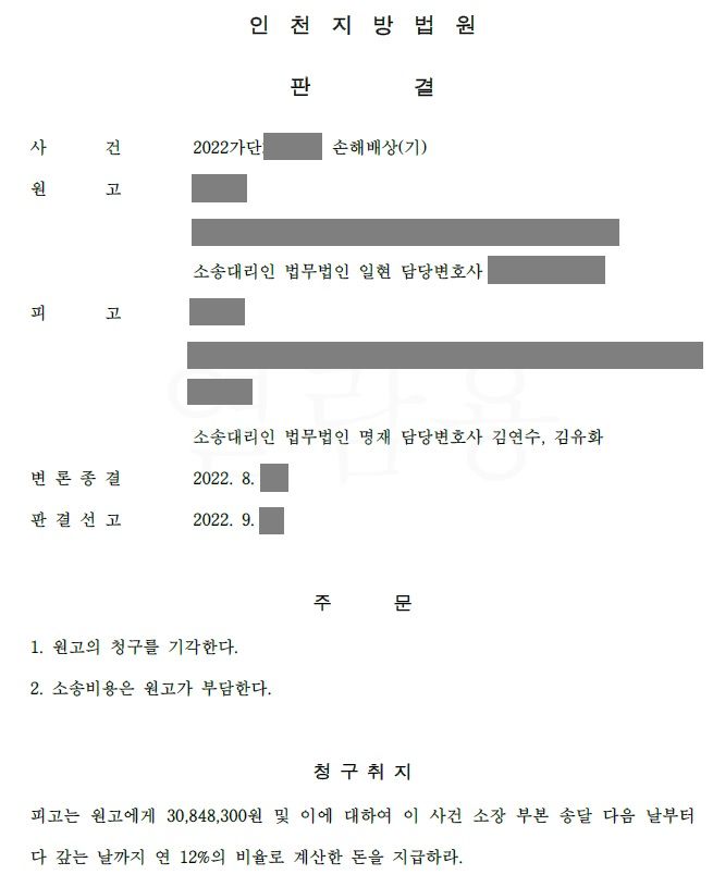 법원은 당연하게도 원고 청구를 모두 기각하고 의뢰인의 승소 판결을 선고하였습니다. 저는 소송비용확정신청을 통해 오히려 의뢰인이 소송 방어를 위해 지출한 변호사 비용까지도 가해자인 상사(원고)에게 청구하여 이를 받아내었습니다.