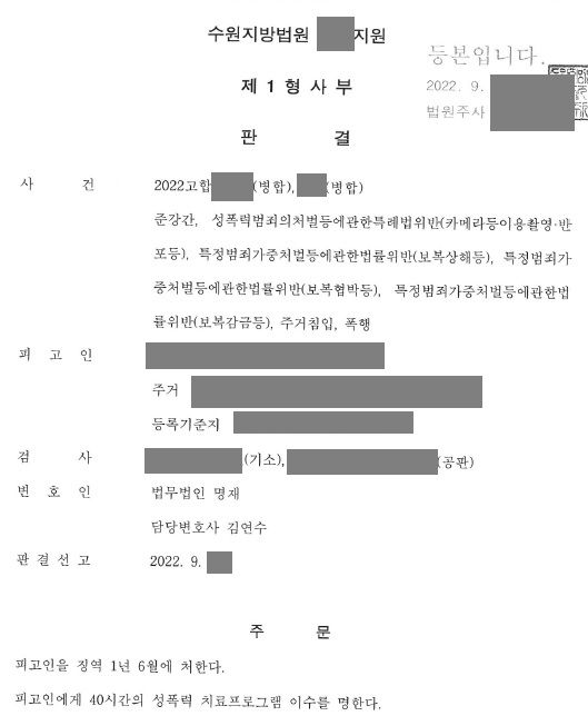 법원은 의뢰인에게 징역 1년 6월, 40시간의 성폭력 치료프로그램 이수를 선고하였습니다. 의뢰인에 대한 법률상 처단형은 징역 22년 6개월까지 가능한 상황이었으나, 최대한의 합의를 통해 양형기준표에 의한 최소한의 형으로 선처를 받은 것이었습니다.