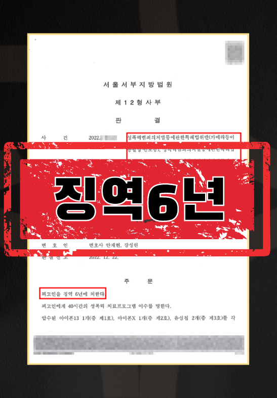 ② 의뢰인의 변호인은수사 단계에 이어 공판 단계에서도 피고인이 의뢰인의 명시적인 의사에 반하여 성관계 동영상을 촬영하였으며, 이를 이용하여 강요, 협박하고 계속해서 돈을 갈취한 것도 모자라 수 회에 걸쳐 폭력을 행사한 것으로서 그 죄질이 매우 불량하다는 점, 이 사건으로 의뢰인이 입은 정신적인 피해가 막대하다는 점 등을 피해자대리인의견서로 정리하여 재판부에 제출하였습니다. 그 결과 피고인이 실형 6년이라는 중형을 선고 받았습니다.