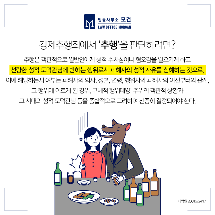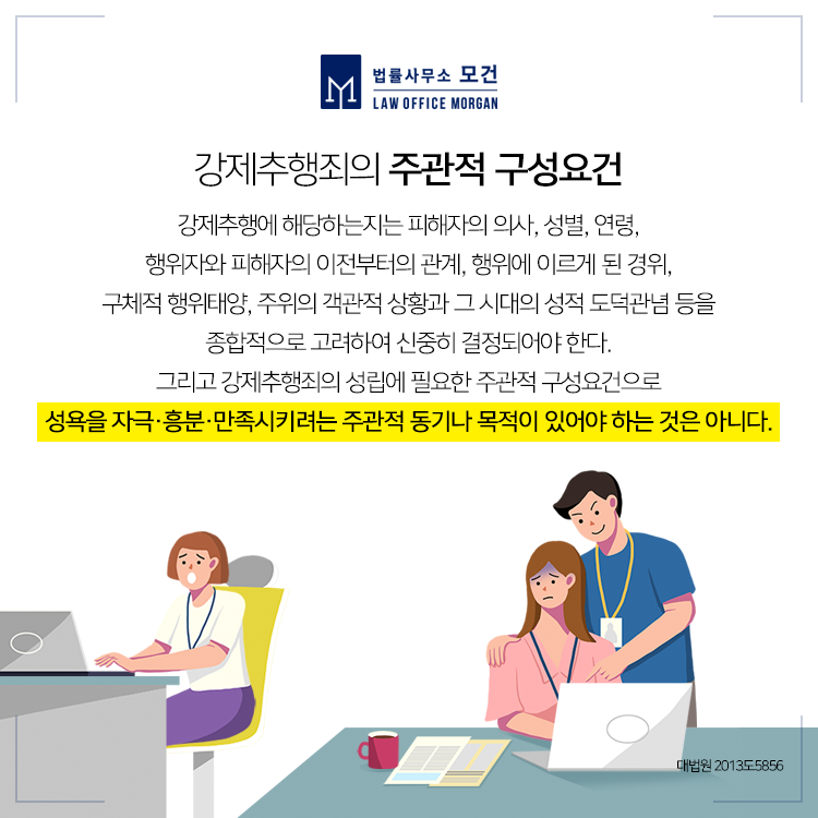 직장 동료나 상사에 의한 불필요한 신체접촉은 피해자의 고소로 형사처벌의 대상이 될 수 있습니다. 우리가 흔히 이야기하는 성추행은 「형법」 상 강제추행죄로 처벌되는데요. 특히 하루 일과 중 오랜시간을 함께 시간을 보내는 회사에서 이러한 성추행 문제가 발생하는 경우가 많습니다.