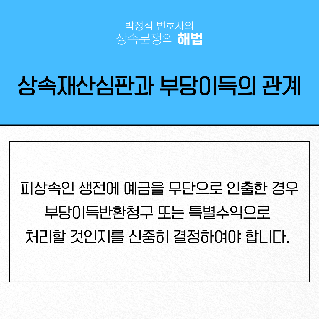 다만 선결문제와 관련한 공방 없이 상속재산분할심판에서 위 무단인출금을 해당 공동상속인의 특별수익으로 처리하는 방법도 사건에 따라서 종종 활용될 수 있습니다. 그러나 간혹 이러한 처리방법은 무단인출한 공동상속인이 초과특별수익자인 경우에는 다른 공동상속인들이 무단인출이 없었다면 상속받았을 재산에 못 미치는 재산만을 분할 받을 수밖에 없는 불공평이 발생하게 됩니다. 따라서 무단인출이라는 점을 입증할 수 있는지, 특별수익으로 처리할 경우 다른 공동상속인들의 불이익이 어느 정도인지 등을 판단하여 부당이득반환청구권으로 갈지 특별수익으로 갈지를 정하는 것이 좋습니다.