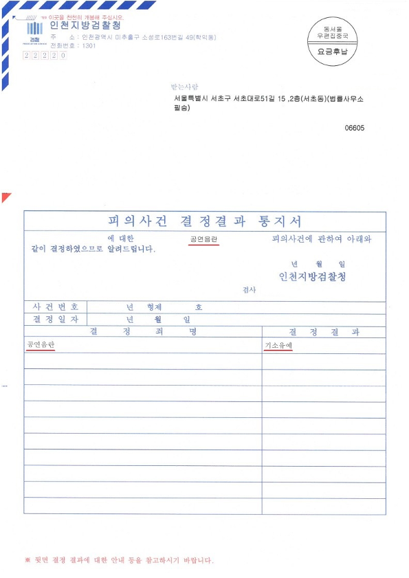 ※ 이에 인천지방검찰청은 의뢰인님에게 "기소유예처분"을 한 사건입니다