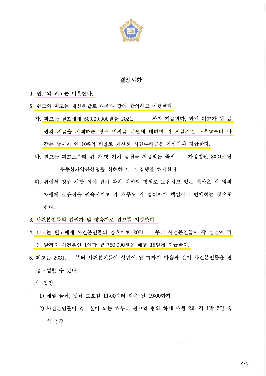 또한 이혼 소송을 제기할 당시에는 둘째를 임신 중이었기에 남편은 아이 1명에 대한 양육비로 50만 원만 줄 수 있다고 하였고, 이에 저희는 둘째를 출산하자마자 출생신고를 하고 기본증명서를 제출하여 아이 1명당 양육비로 75만 원씩을 총 150만 원을 청구하였습니다.