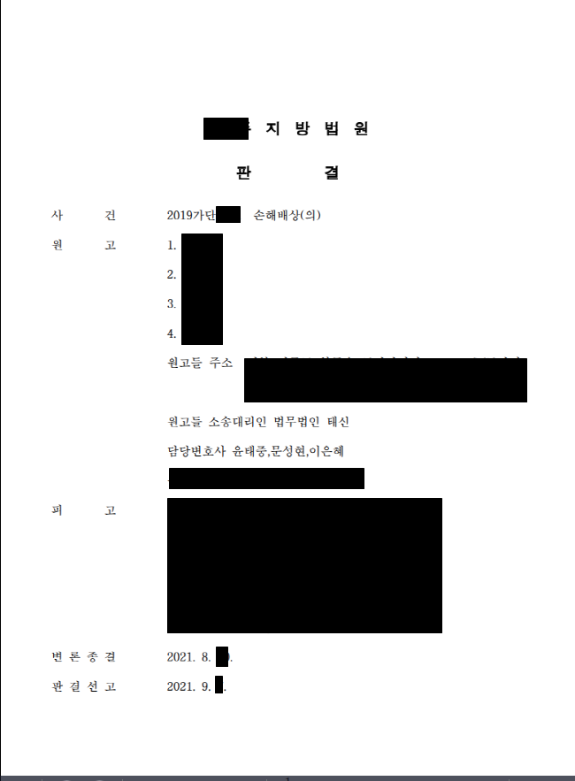 의뢰인들은 가족을 잃었음에도 병원 측에서는 자신들은 잘못이 없다는 자세로 일관하여 크게 억울해하는 사건이었습니다. 비록 망인이 연로하여 큰 배상금을 인정받지는 못했지만 태신의 출중한 변론으로 인하여 의뢰인들은 법원으로부터 병원의 잘못에 대해서 인정받음으로써 그 억울함을 풀 수 있었던 사건이었습니다.