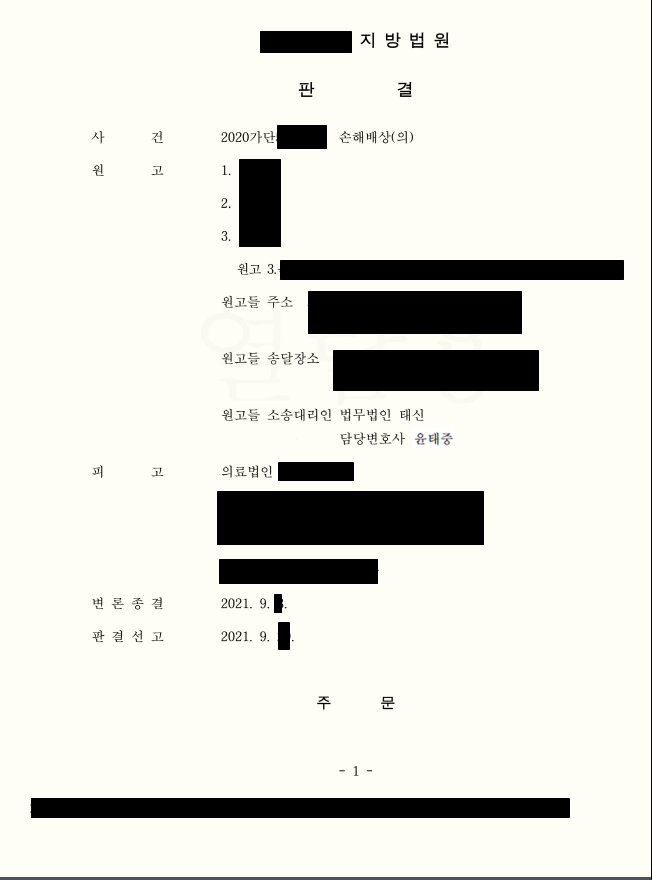 태신은 의뢰인이 제공해준 의무기록을 면밀히 검토한 후 병원을 상대로 소송을 제기하였고, 변론과정에서 의학적 지식과 경험을 활용하여 쟁점사항에 대해서 충실히 입증함과 동시에 전문심리위원 감정 절차로 법원에 제출된 전문감정인의 회신서를 면밀히 분석하고 이를 활용하여 주장을 보다 더 보강해 나갔습니다.