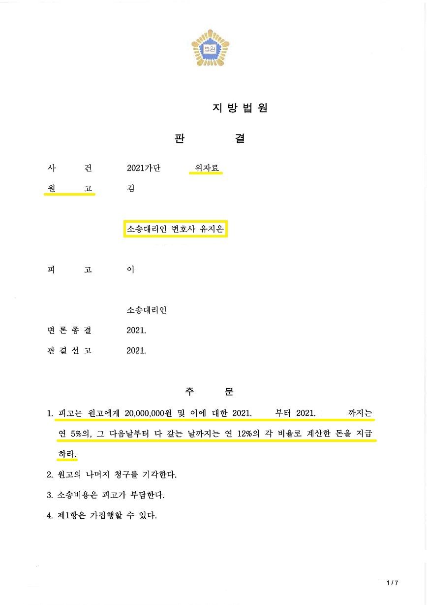 통상적으로 배우자를 피고에 포함하지 않고, 상간자만 상대로 위자료 청구를 할 경우 1천만 원에서 1,500만 원 상당의 위자료 액수가 나오는데, 이 사건에서는 위자료로 2천만 원을 지급받으며 성공적으로 마무리가 된 사안입니다.