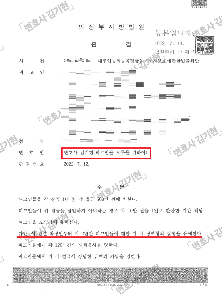또한 피고인들이 대부업 과정에서 얻은 수익 대부분이 투자 실패로 사라졌다는 점, 대부 이용 채무자 다수가 피고인들의 선처를 바라고 있고 피고인들로 인해 생활에 도움을 얻었다는 탄원서를 제출했다는 점, 피고인들이 가지는 개인적 특이사항(이 부분은 공개할 수 없습니다) 을 강조하여 결국 집행유예 판결을 받아내게 되었습니다.