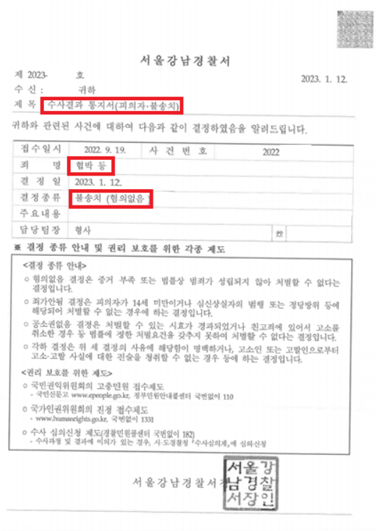 의뢰인과 고소인은 과거의 대화 내용을 보았을 때 대화 스타일상 거친 언어를 서슴없이 썼기에 공포심을 느꼈다고 볼 수 없고, 고소인이 전체 대화내용 중 일부만을 제출하여 다른 대화내용을 보았을 때 고소인이 먼저 연락을 유도하고 오히려 의뢰인분은 보이스톡을 거절하는 등 소극적으로 행동한 점을 강조하며 상대방으로부터 해당 행위가 발생된 점을 기재한 의견서를 제출하였습니다.