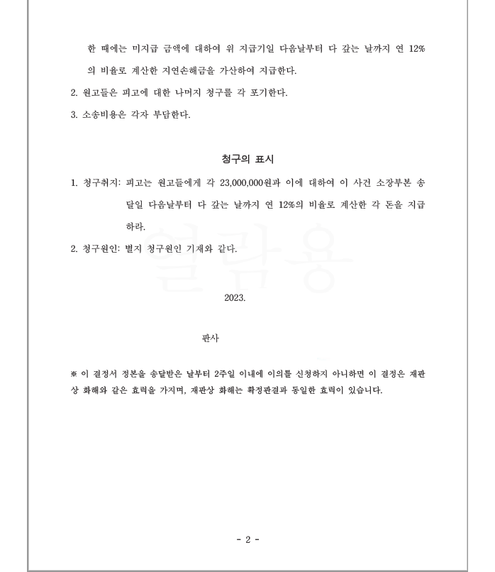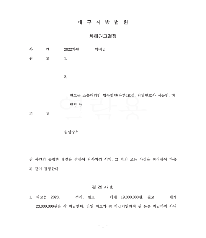 저는 즉각 약정금청구소송을 제기하였고 법원은 의뢰인들에게 분담금을 환불하라는 화해권고결정을 내려 확정되어 의뢰인들은 분담금을 돌려받게 되었습니다.