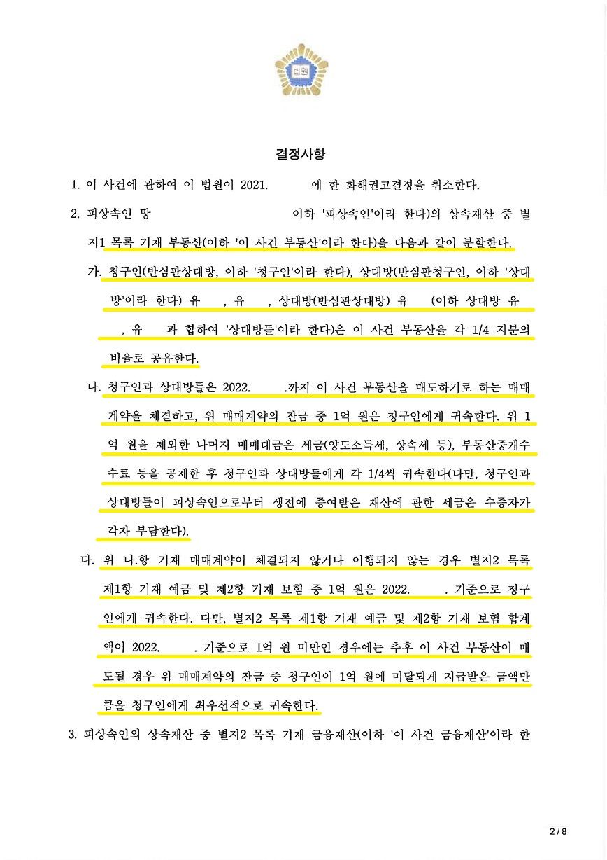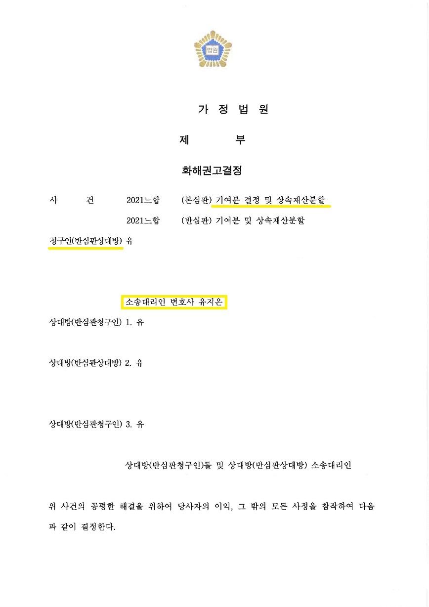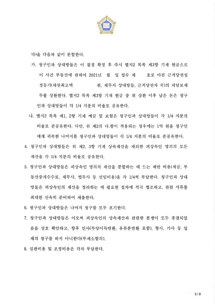 이에 저희는 상대방들이 어머니를 모시는 것을 기화로 생전에 상당한 특별수익을 하였음을 입증하는 데 주력하였고, 결국 양측 대리인들끼리 장시간 대화와 설득 끝에 4명이 똑같이 상속재산을 분할하되, 저희 의뢰인만 기여분 명목으로 1억 원을 더 받아오는 것으로 합의가 성립되었으며, 이와 같은 내용으로 화해권고결정을 받아 이 사건이 확정되었습니다.
