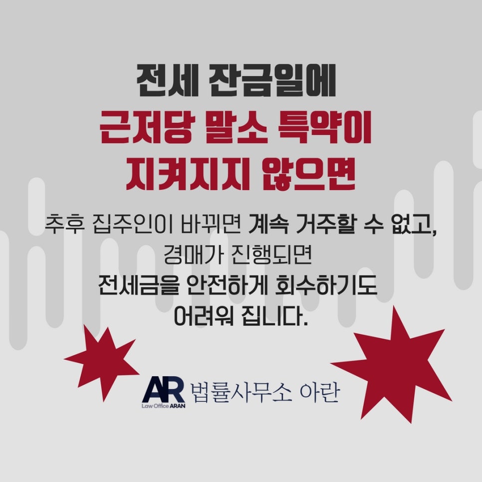 이 경우 "임대인은 잔금일에 근저당권설정등기를 말소하여야 한다."라는 특약을 기재하고 전세계약을 체결하시는 경우가 상당히 많습니다.