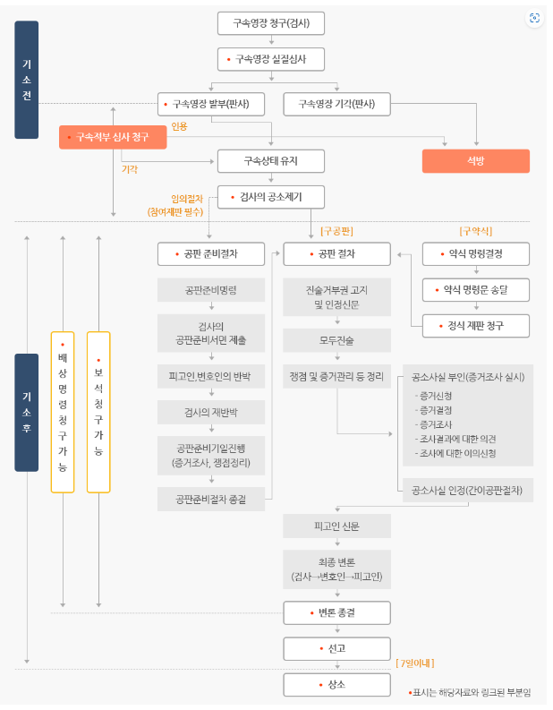 기소후 단계는 검사의 청구에 따라 구공판과 구약식으로 나뉘어지고, 임의절차로서 공판준비절차(참여재판의 경우에는 필수)가 마련되어 있으며 이상의 절차를 마친 후 변론종결과 판결 선고까지를 포함하고 있습니다.