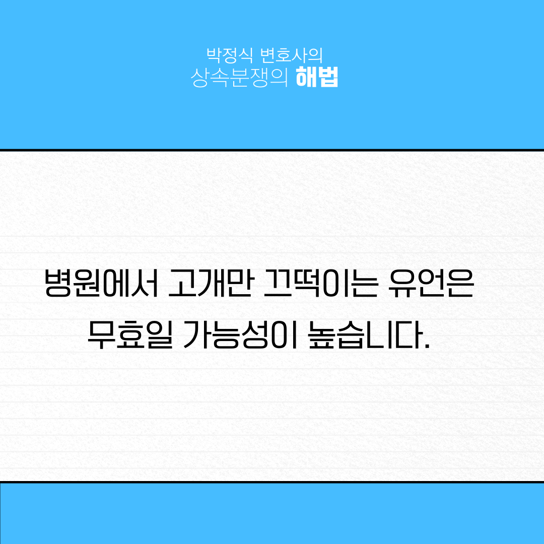 가. 공증업무를 취급하는 변호사가 반혼수상태로 병원에 입원 중인 유언자에게 유언 취지를 묻자 유언자가 고개를 끄덕거린 것만으로 민법 제1068조 소정의 공정증서가 작성된 것이라고 볼 수 없으므로 그 유언은 “유언 취지의 구수”가 없어 무효라고 판단한 대법원 판결이 있습니다(대법원 1993. 6. 8. 선고 92다8750 판결).