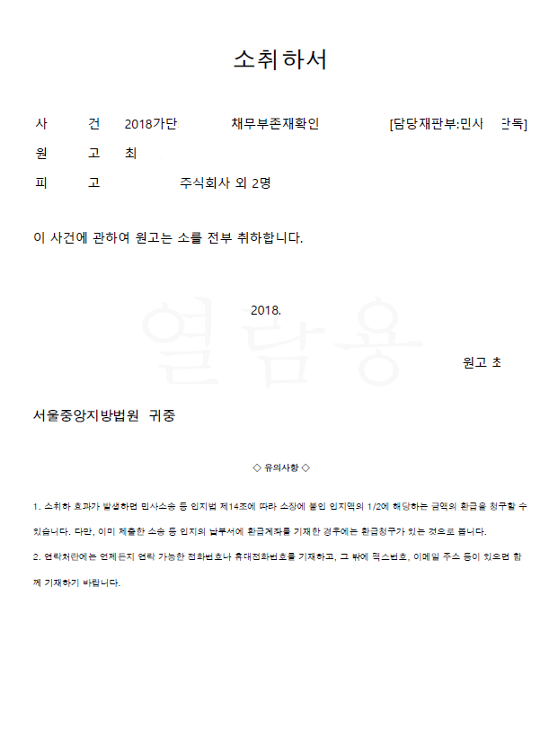 저는 즉각 민사소송으로 채무부존재확인의 소 및 지인에 대한 형사고소(사문서위조 및 동행사, 사기 등)를 진행하였고 지인이 위 죄로 유죄가 인정되어 처벌을 받자 피고들은 명의도용 사실을 인정하고 의뢰인에 대한 채무를 부존재 처리하겠다고 하여 의뢰인은 소를 취하하였습니다.