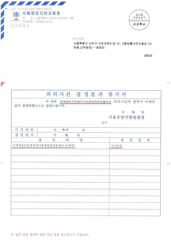 ※ 성매매 사건은 벌금형을 선고받느냐, 기소유예처분을 받느냐가 쟁점인 사안입니다. 그러나 벌금형은 성범죄 전과 기록으로 남지만 기소유예처분은 전과기록이 남지 않습니다. 따라서 성매매 사건의 경우 모든 수단을 동원하여 기소유예처분을 받는 것이 중요합니다.