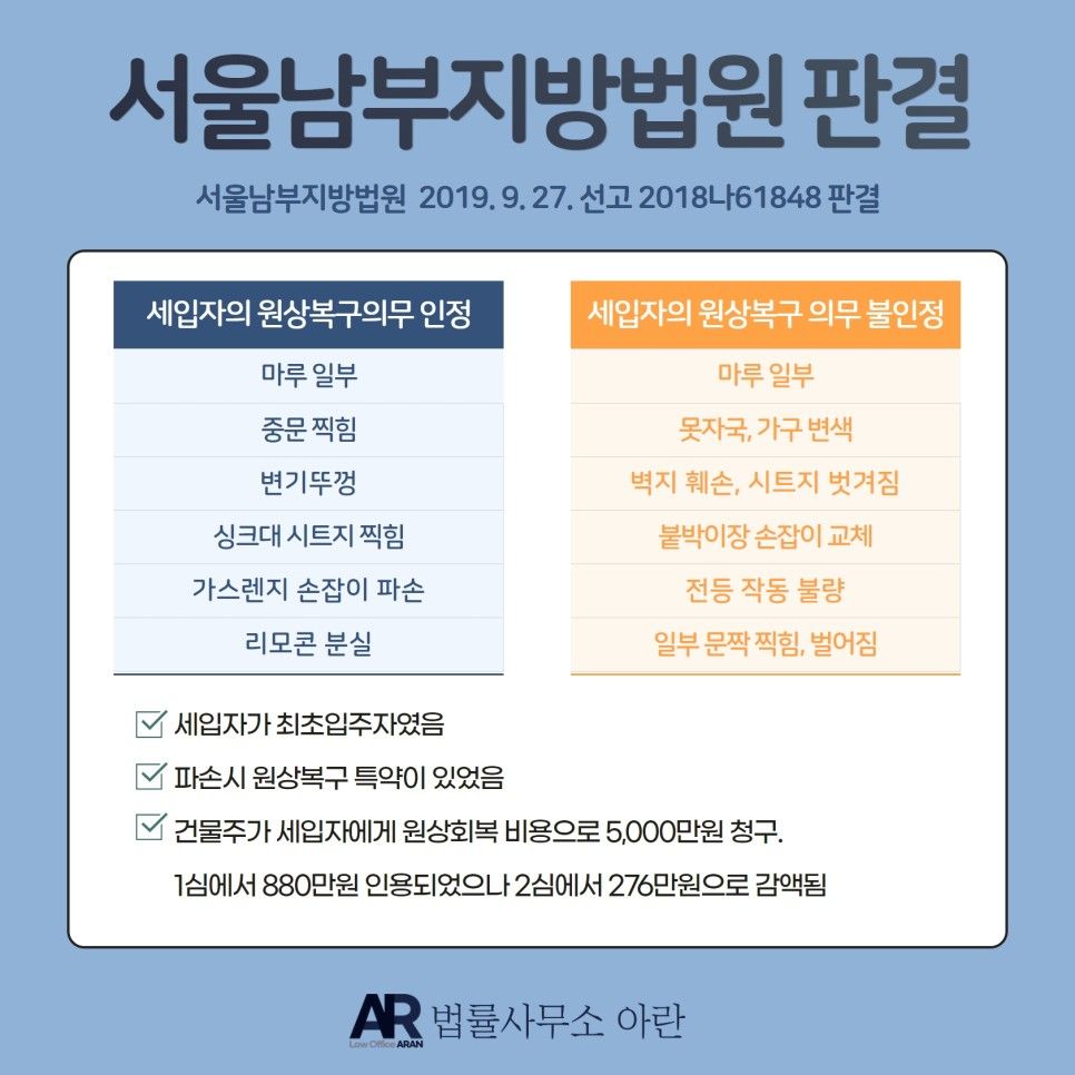 원고는 피고가 퇴거한 이후, 피고가 위 아파트를 파손하였다며 피고를 상대로 약 5,000만원의 원상복구 비용을 청구하였습니다. 위 사건에서 제1심은 880만원 가량에 대해서만 세입자인 피고의 원상복구 의무를 인정하였습니다. 그러나 제2심에서는 그마저도 대부분 기각되었고 276만원에 대해서만 세입자의 원상복구의무가 받아들여졌습니다.