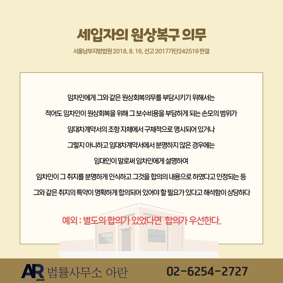 안녕하세요. 법률사무소 아란 대표 최아란 변호사입니다. 오늘은 주택이나 상가 세입자가 원상복구를 어디까지 해 주어야 하는지에 대해서 판례를 중심으로 살펴보겠습니다.