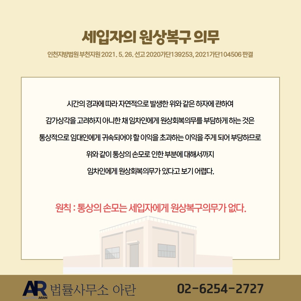 그럼에도 불구하고 임대인들이 세입자가 원상복구 하라고 주장하면서 보증금 중 일부를 반환하지 않는 방법으로 감가상각 비용을 충당하는 경우가 이따금씩 있습니다. 임대인이 지나친 원상복구를 강요하면서 보증금에서 원상복구 비용을 공제하고 있다면 막무가내로 끌려다니지 마시고, 부동산 전문 변호사와의 상담을 통해 합리적인 대응을 해 나가시길 권유드립니다.
