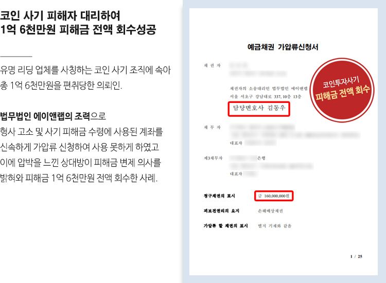 그 결과, 범죄 조직이 사용하던 법인 계좌 전체가 사용할 수 없는 상태가 되었고, 이로 인해 자금 압박을 느낀 상대방 측에서 피해금 전액을 변제하겠다며 가압류 해제를 요청해 왔는데요. 이로써 의뢰인은 별도의 소송을 제기하지 않고도 범죄 조직으로부터 피해금 1억 6천만 원 전액을 회수할 수 있었고, 모든 문제가 해결된 이후에 가압류를 해제하였습니다.