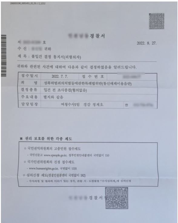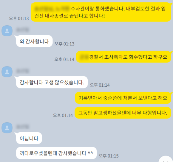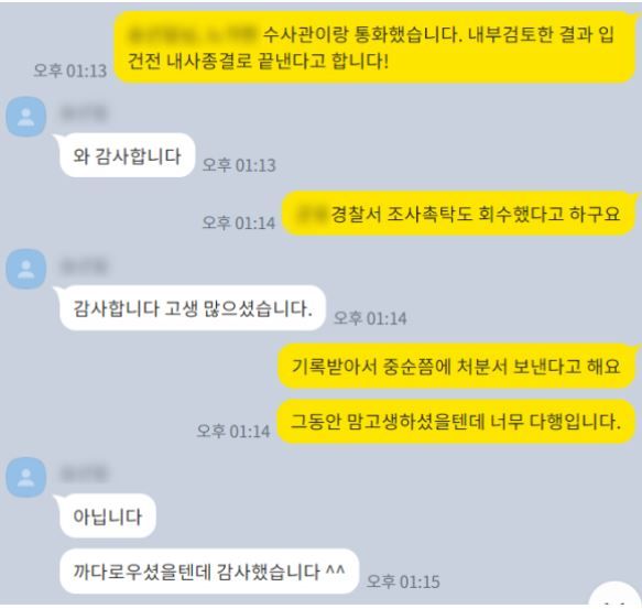 그 결과, 업무에 착수한지 한 일주일 만에 '통매음 내사종결'로 사건을 마무리 할 수 있었습니다.